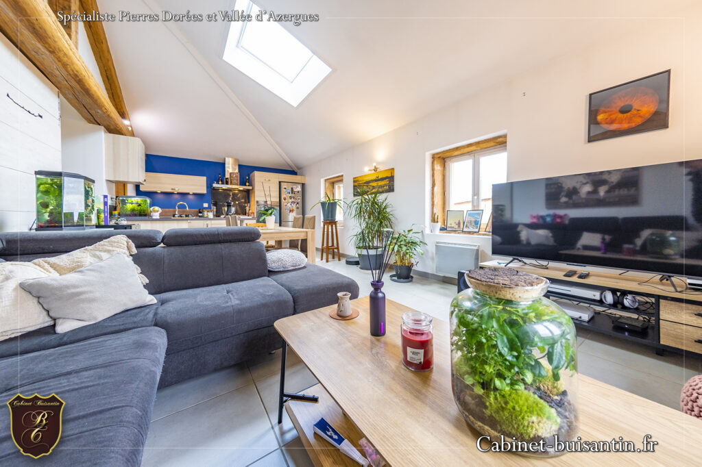 EXCLUSIVITE – Situé à 10 minutes de Villefranche, accès direct à toutes commodités, tout en étant proche de la nature. Dans une bâtisse en pierres, appartement situé au 2ème et dernier étage de 73 m² habitables (72.75 m² loi carrez). Il comprend: Entrée, cuisine équipée ouverte sur le séjour, cellier/buanderie, 2 chambres, salle de bains et wc. Appartement lumineux et fonctionnel en très bon état. Un garage d’environ 17.50 m² complète ce bien.