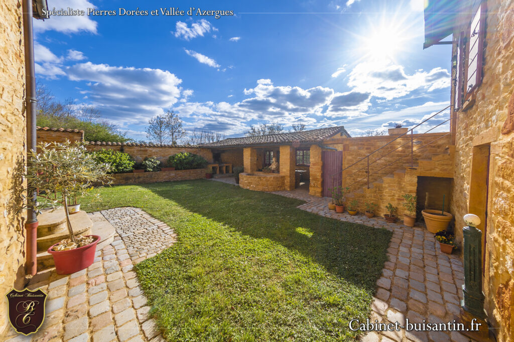 Située dans un environnement privilégié, cette propriété en pierres dorées du 19ème séduira les amateurs de biens de caractère à la recherche de sérénité. La maison développe 185 m² habitables comprenant un spacieux séjour avec cheminée en pierres et 5 chambres (dont une suite parentale à finir d’aménager). Des dépendances : Cave, atelier, cellier, une pièce d’été de 44 m², buanderie (..), ainsi que 2 garages complètent ce bien. La cour intérieure offre un lieu intime et cosy abrité par un préau. L’ensemble est édifié sur un terrain de 2 ha offrant un espace de nature bénéficiant d’une vue splendide sur les monts du beaujolais.